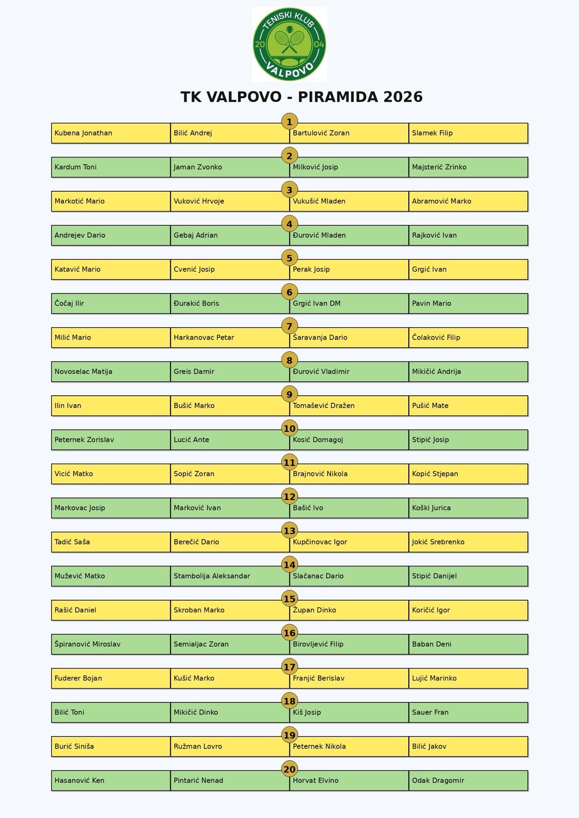 Ovogodišnje izdanje donosi rekordan interes – čak 80 igrača iz Valpova i okolice kreće u borbu za naslov, čime piramida dodatno potvrđuje svoj status jednog od najmasovnijih oblika teniskog natjecanja u regiji.