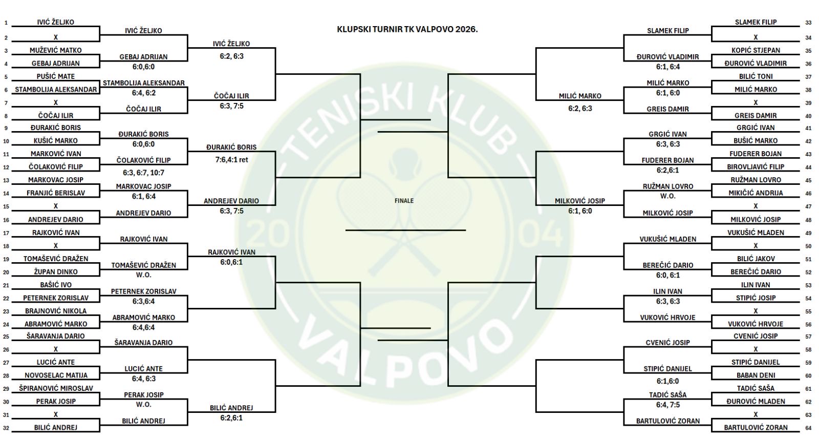 Od zimske sezone preostaje još jedno, završno kolo Zimske lige parova Teniskog kluba Valpovo, koja se tijekom zime igrala subotom na terenima Teniskog centra Valpovo i Teniskog centra Jezero u Osijeku. Liga je započela 8. studenoga 2025. godine, odmah po završetku ljetne sezone, te je kroz 20 kola okupila ukupno 18 članova. Prvo mjesto već je osigurao Zorislav Peternek sa 121 bodom, dok je borba za drugo mjesto i dalje neizvjesna do samog kraja između Daria Šaravanje i Hrvoja Vukovića, koji trenutno dijele isti broj bodova – 87.